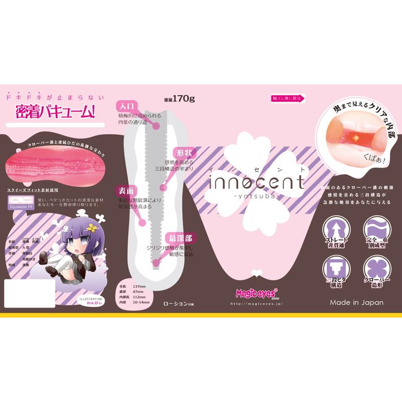 軸ズレ無し製法で生成したスクイーズフィット素材を新規採用。密着バキュームのクローバー溝と3段に窄まる内部構造に搾り取られる感覚を味わえるイノセントヨツバ!は実用性に優れた170gハンドタイプ!高刺激な内部層とそれを優しく包む外装部で外はプニプニ中はギチギチ!!付属のローションを注入し四葉ちゃんに一生懸命搾られて下さい!!完全2重別成形の為、裏返し洗浄の際は内部層が剥がれる恐れがありますのでご注意下さい。  | |